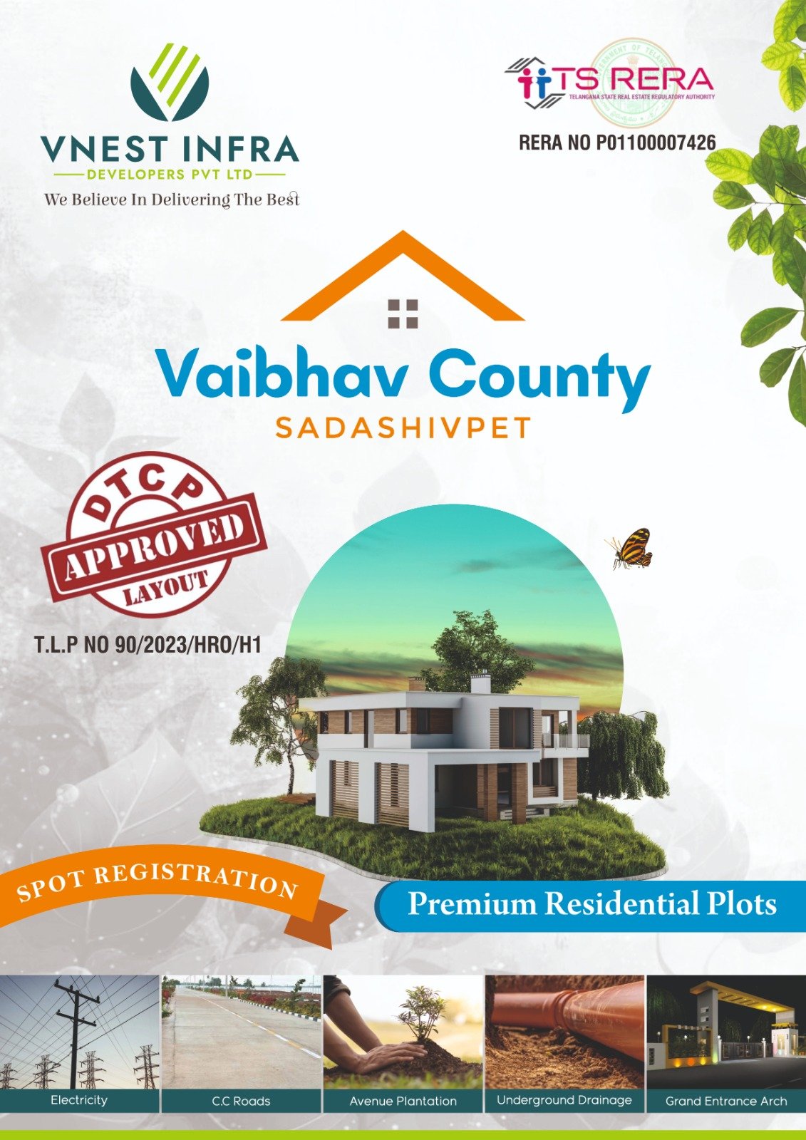 Welcome to Vaibhav County by VNEST INFRA DEVELOPERS If you're looking for the perfect plot in Sadashivapet, Hyderabad, your search ends here. Nestled amidst lush greenery, Vaibhav County offers a serene living experience. This 10-acre plotted development venture has something for everyone, whether you're seeking an investment opportunity or planning to build your dream home. Conveniently located near key city points, Vaibhav County ensures a seamless daily commute.